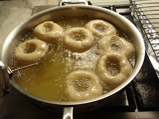 After 3 hours of heavy drinking at my friend’s apt, I realized I had dough resting, rising, waiting to be fried. So I went home, tipsy, or maybe drunker than I thought… Once I got home, the dough had nicely risen to almost triple the original size. I rolled it out, then cut out the circles. After this, you are supposed to wait for another 40-60 minutes to double the size, but I had to go to another party, so I waited for about 20 minutes, then fried them. Meanwhile, I made glaze with melted butter, powdered sugar and some water.